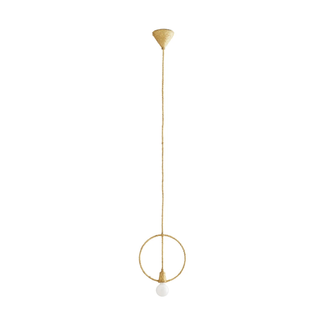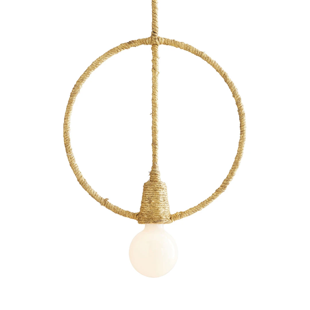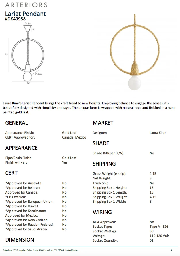 | Materials | Rope; Gold Leaf; Socket Type: Type A – E26; Socket Wattage:60; Socket Quantity:01; Bulb: A19; *REWIRING REQUIRED: Cannot be rewired for Int'l use; Cord Color: Rope Wrapped Cord; Cord Length (Exit):10; Maximum Chain/Pipe Extension:9.5'; Plug:Hardwired |