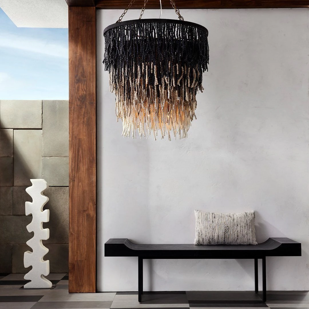 Showcasing unique design and materials, the Lizzy Chandelier from Arteriors Home is created with a layered concentric construction crafted from black, gray, and white wooden beads that are strung from an antique brass iron frame. The melange of the neutral hues, along with the cascading formation of the beads, creates an ombre effect. A cluster of five lights illuminated the entire piece and highlights every detail and texture. *Additional Chain Available.