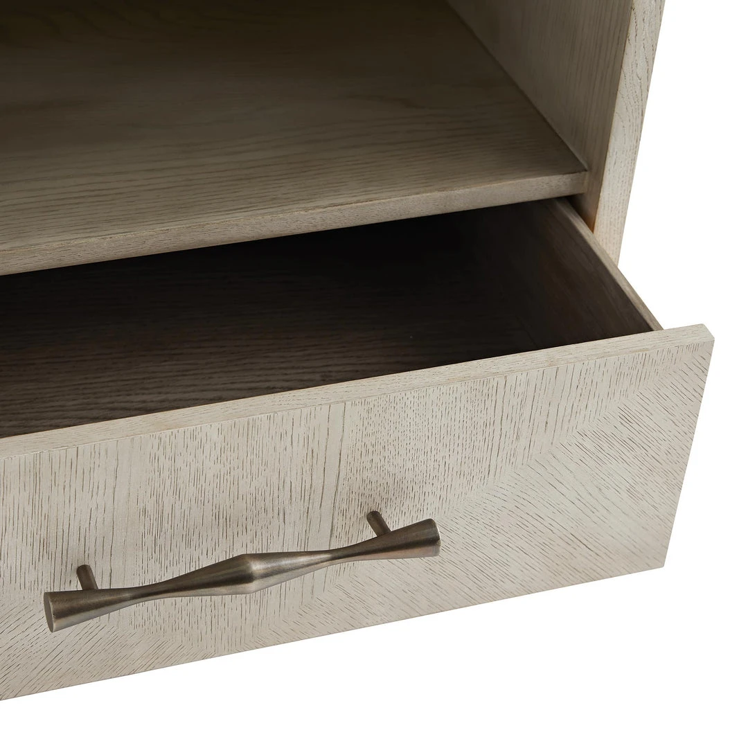 The Mallory Side Table from Arteriors Home delivers an elegant balance of form and function to your home. Crafted entirely from solid oak, the Mallory features a seamless design highlighted by a unique, smoky grey veneer. The Mallory offers thoughtful details, like a wide tabletop, a spacious bottom drawer that opens and closes smoothly on soft close slides, and an aged finish brass drawer pull. Tables like the Mallory Side Table are ideally placed in the living room next to the sofa or placed by the bedside in the master suite.Â