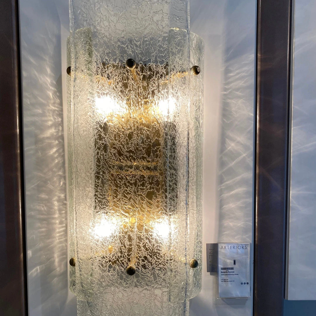 The Metairie Sconce from Arterors Home features a clear glass plate layered with crackled glass that forms this striking two-light sconce. An antique brass iron backplate sets a refined tone to the sculptural form. *Damp-rated, although limited covered outdoor areas may affect the finish.