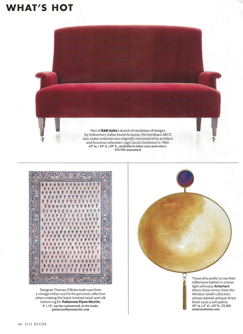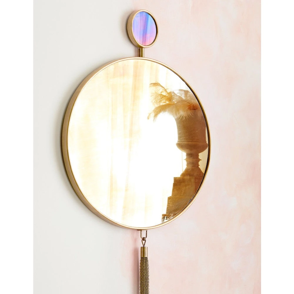 A classic mirror redefined with bohemian flair, The Moon Glow Mirror designed by Windsor Smith for Arteriors Home is a representation of a celestial space when the planets perfectly align. The mini mirror balanced over the large circular antique brass frame features a deep plum hue while the large mirror boasts a stained antique finish. Antiquing is hand applied and will vary. It hangs sturdy and flush to the wall using a security cleat mount. * As seen in Elle Decor magazine.
