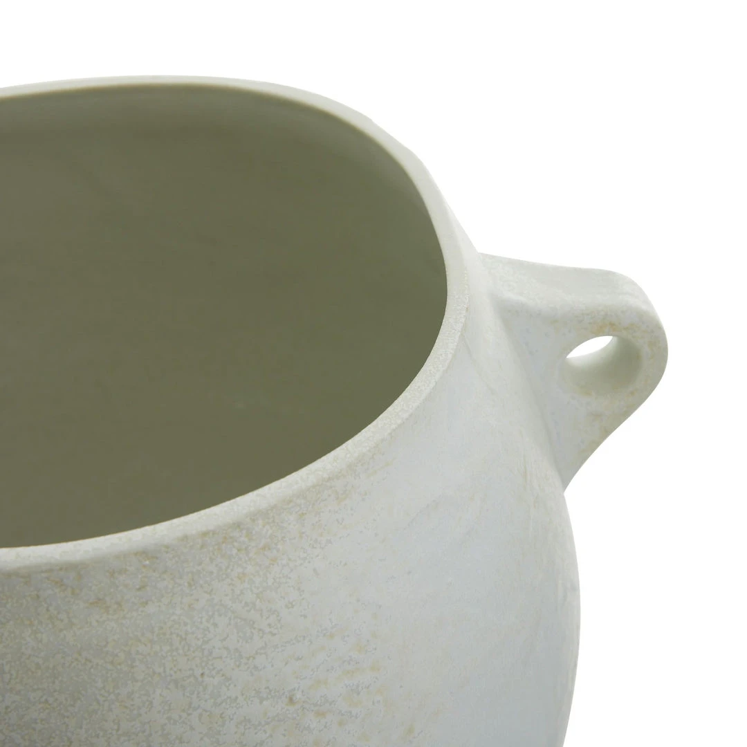Crafted from white porcelain, the design of the Myla Vase from Arteriors Home was inspired by ancient Greecian water jars In an urn-style shape. The body of the vase rests on a round base and is accented with a charming handle and rich textures. *Finish will vary.