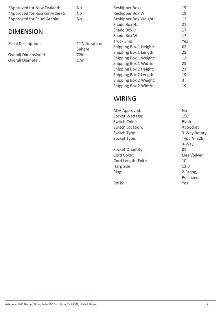 | Materials | Iron; Ivory Shade; Cream Cotton Lining; 3-way Lighting; 150 max watt |