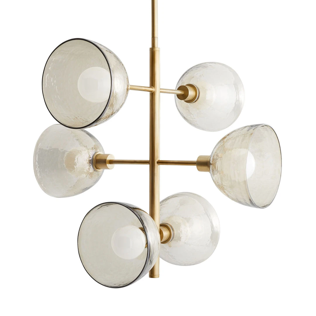 The Norwich Chandelier from Arteriors Home speaks to a modern casual design with Bauhaus influences. The alternating tiered silhouette is composed of six hammered glass bowls in a smoke luster finish on an antique brass iron frame. Each bowl houses a single bulb, and when illuminated, exposes the imperfect qualities of its handcrafted texture. *Finish will vary. Additional pipe available (PIPE-500). Damp-rated, although limited covered outdoor areas may affect the finish.