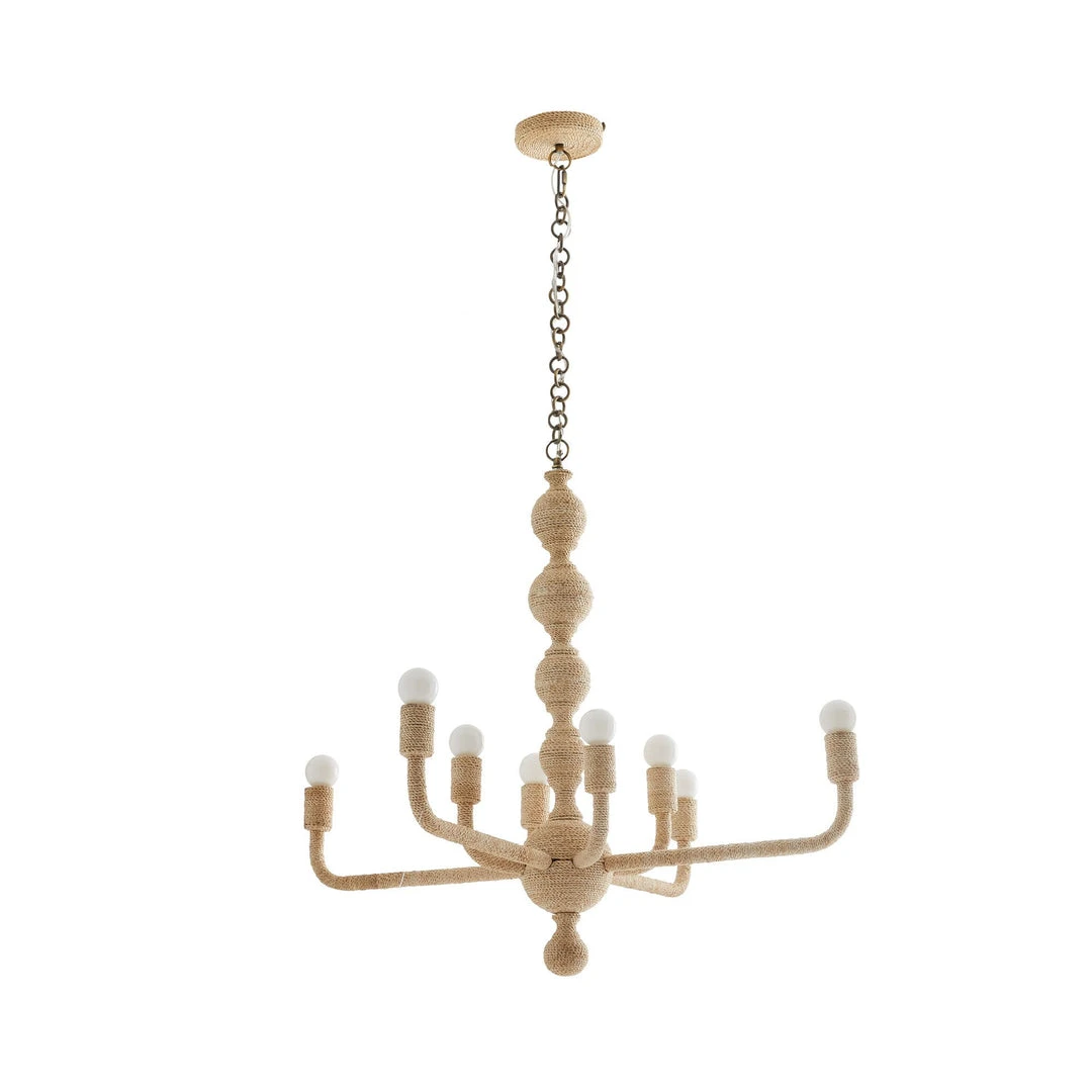 A traditionally shaped chandelier is updated with raw, rustic materials to create the overtly organic Olaf Chandelier from Arteriors Home. Its antique brass steel frame is wrapped in natural abaca and is adorned with stacked spheres that deliver a feminine element to its classic 8-light form. Abaca will vary. Additional chain available (CHN-266).