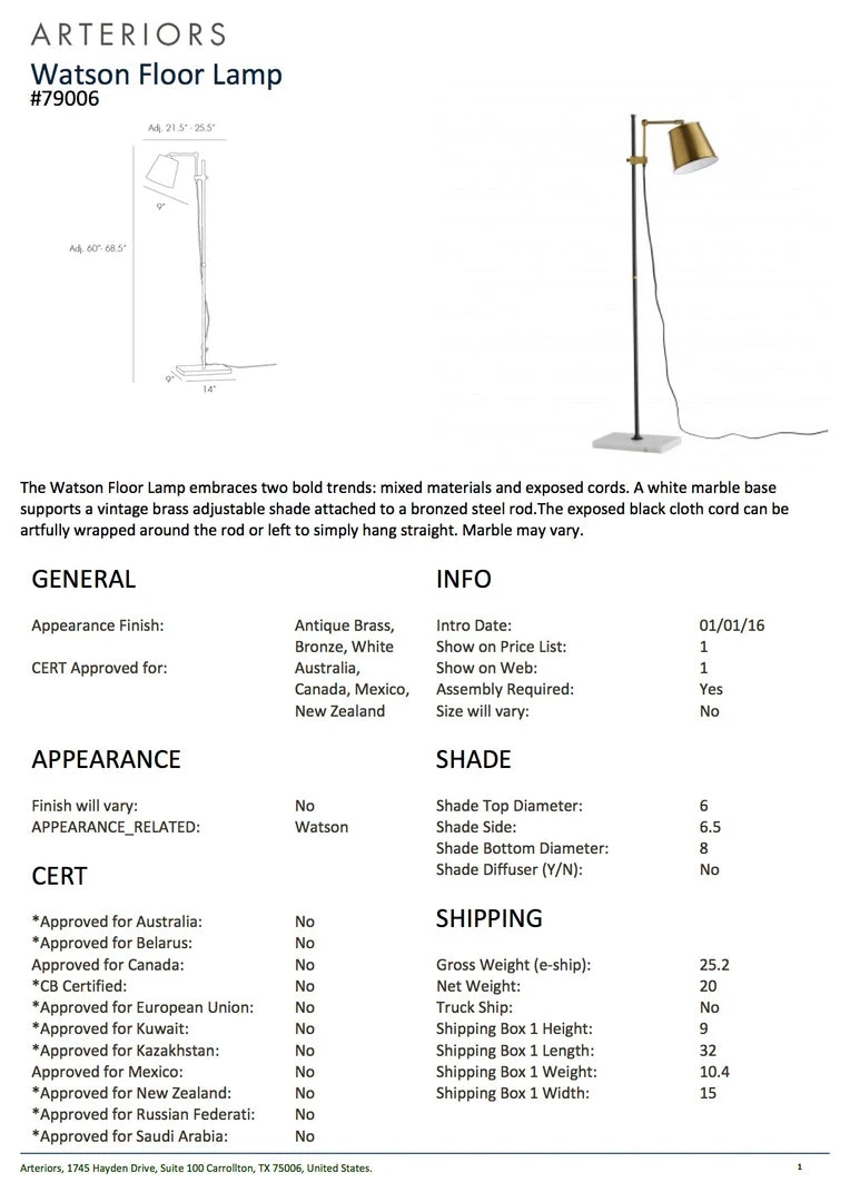 SKU: arteriors-home-7491258309 Categories: Arteriors Home, Brands, Floor Lamps, Lighting, New, New Arrivals Tags: Arteriors home lighting, Arteriors lamps, Brass, Living room, Snow marble, Vintage brass shade, Watson Vintage Lighting, White