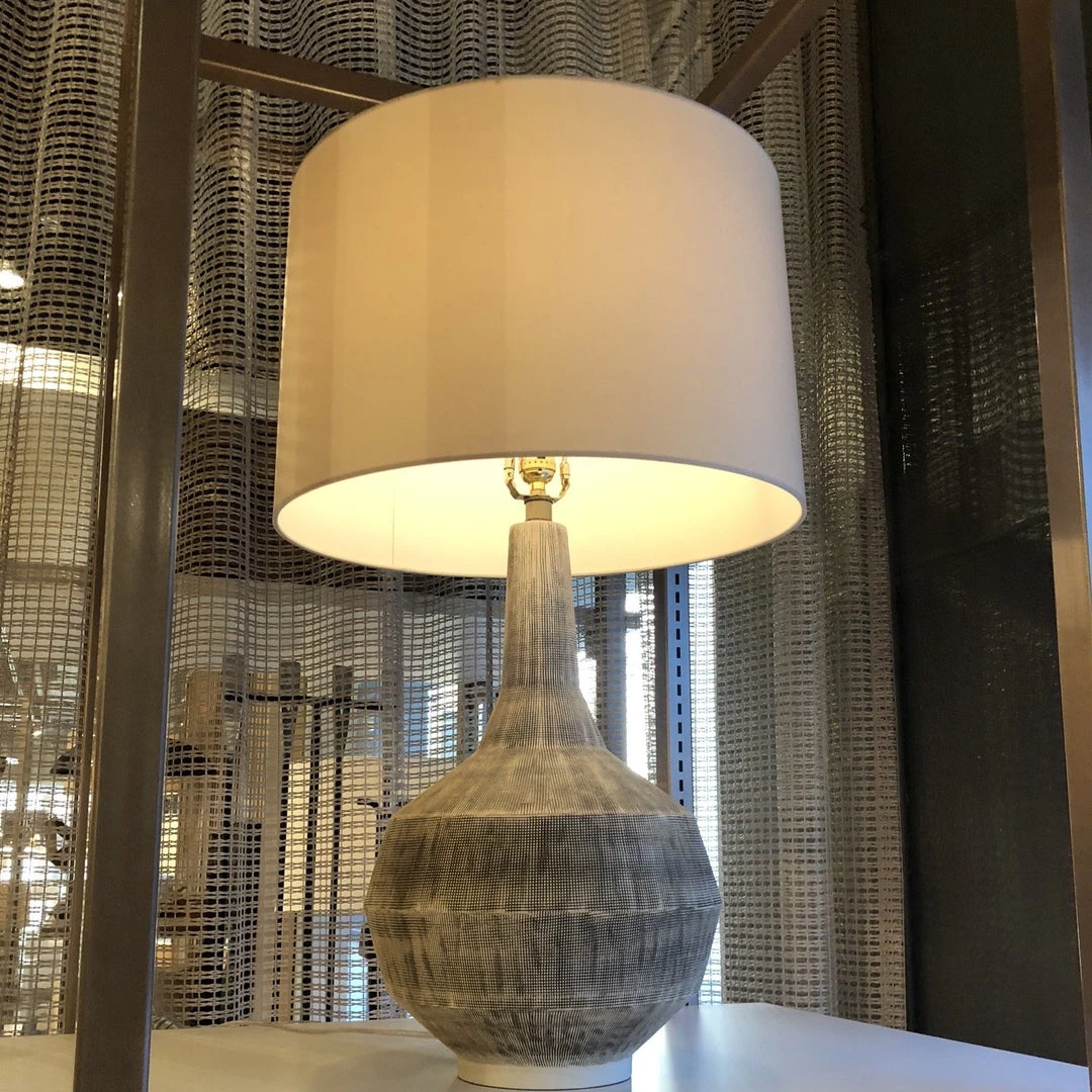 The Webber Lamp presented by Arteriors Home suggests a connection to handcrafting. Sculpted from porcelain, the intricate hand etched pattern offers a truly unique motif that is accentuated with a nomadic desert finish and a hand applied glaze. Topped with a putty microfiber drum shade and off white cotton lining, the Webber is an ideal light for home offices, bedrooms and living spaces. *Finish may vary.