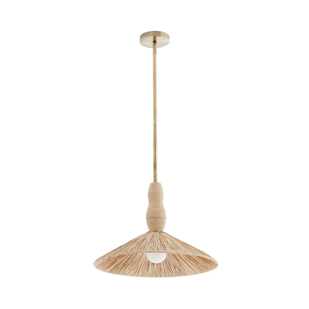 Form meets function with the Nubia Pendant from Arteriors Home. The natural raffia construction of the undulating shape of the shade is matched with a sculptural stem wrapped in natural abaca. Suspended by antique brass steel to refine its natural aesthetic. *Rattan will vary. Additional chain available (CHN-266)