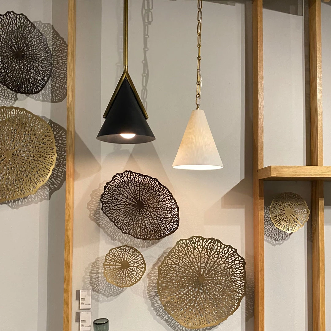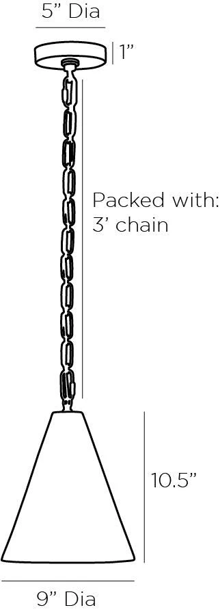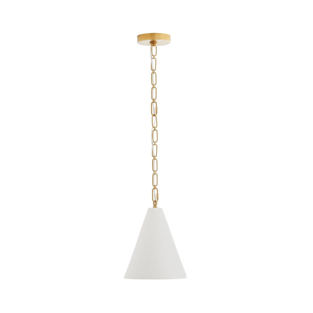 The Oakland Pendant from Arteriors Home finds a balance between traditional and modern. The conical-shaped shade of the pendant is crafted from porcelain in a matte bone finish and is suspended from an antique brass steel link chain. A chiseled texture has been applied to the shade, adding a sculptural appeal to its clean-lined aesthetic. The light delivers a translucent quality when in use and helps highlight the bone China-esque details. Additional chain available (CHN-262). Damp-rated, although limited covered outdoor areas may affect finish.