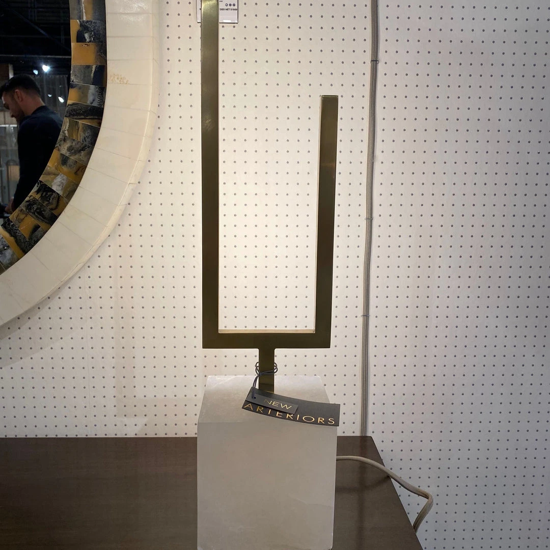 The Odell Lamp in Antique Brass from Arteriors Home delivers rich materials with modern geometric style. The minimalist profile is constructed of antique brass iron in an asymmetrical U-shape, which conceals an LED strip that traces the frame, and is exhibited on a white alabaster base. When illuminated, the white acrylic diffuser softens the glow and create a dramatic backlight. Finish will vary.