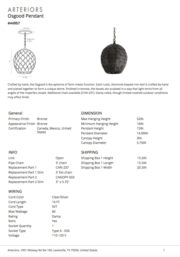 Be the first to review “Arteriors Home Osgood Pendant Bronze New Arrivals” Cancel reply