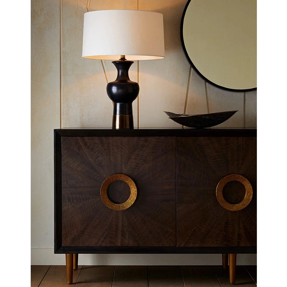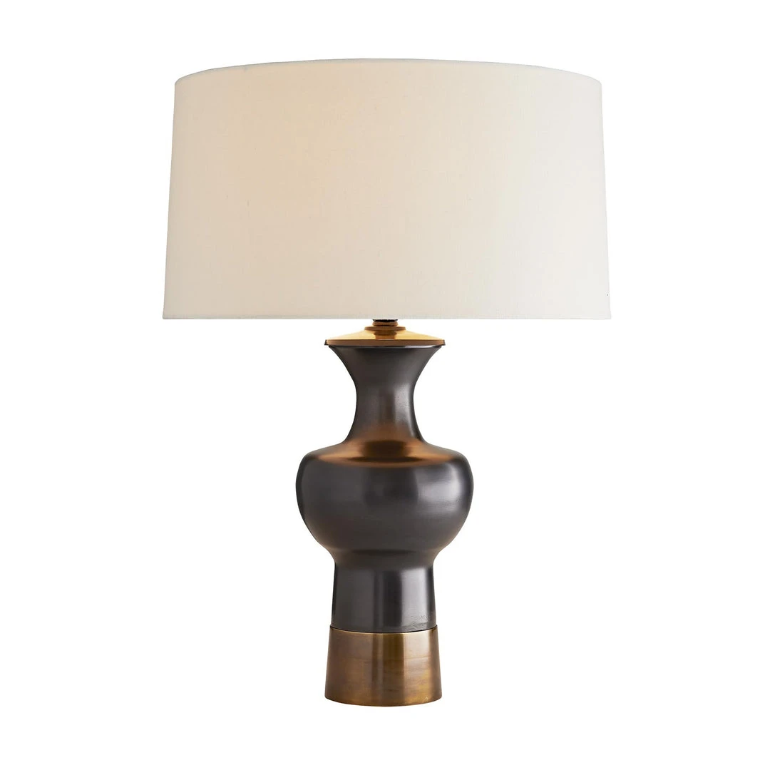 The Pablo Lamp from Arteriors Home features a shapely traditional urn design. The modern edge of the curves gives the light fixture flair. Constructed of aluminum, the base is then polished with an oil rubbed bronze finish, then accented at the base with a band of antique brass. The dark and gold combination is masculine overall. The Pablo Lamp is topped with an ivory drum linen shade with white cotton lining.