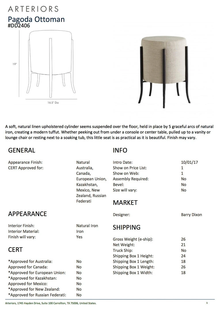 The Pagoda Ottoman from Arteriors Home creates a modern feel in any space. The natural linen upholstered tuffet rests on top of 5 arcs of natural iron. Ottomans like the Padoga Ottoman from Arteriors Home adds the perfect touch that captures attention weather in your home or office.