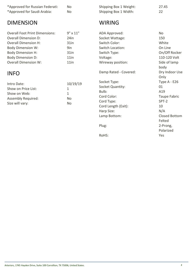 | Materials | Resin; Antique Brass Finish;; White Linen Shade; Socket Wattage:150; Switch Location: On-Line; Switch Type: On/Off Rocker; Damp Rated – Covered: Dry Indoor Use Only; Socket Type: Type A – E26; Bulb: A19; Cord Length (Exit):10 |