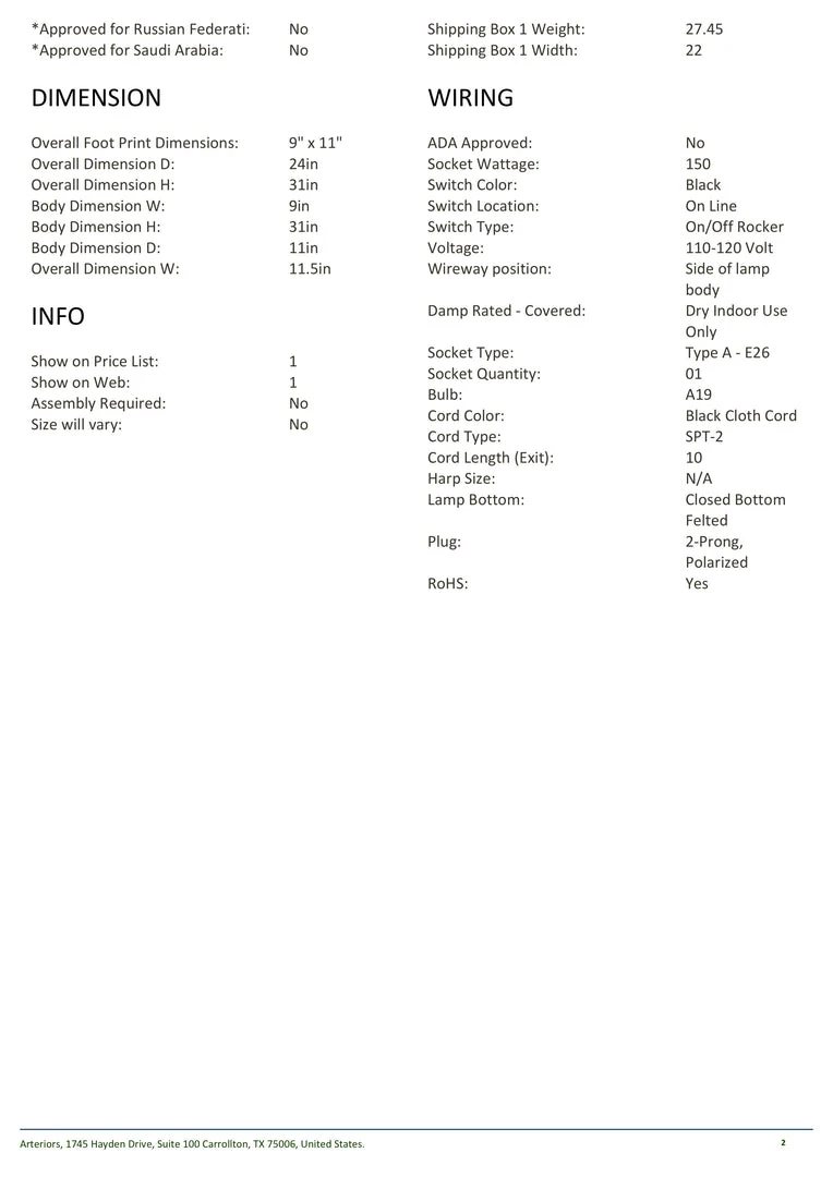 | Materials | Resin; Steel; Bronze Finish; White Linen Shade; Socket Wattage:150; Switch Location: On-Line; Switch Type: On/Off Rocker; Damp Rated – Covered: Dry Indoor Use Only; Socket Type: Type A – E26; Bulb: A19; Cord Length (Exit):10 |