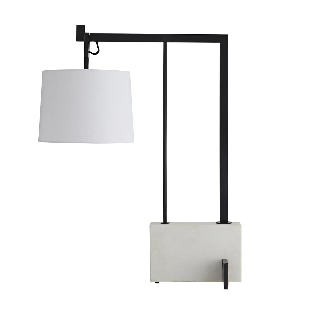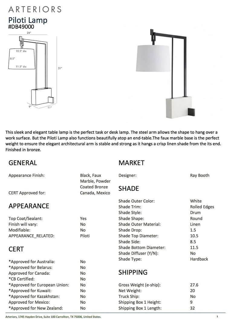 The sleek and elegant Piloti Table Lamp from Arteriors Home is the perfect task or desk lamp. The steel arm allows the light to hang over a work surface. But the Piloti also functions beautifully atop an end-table. The faux marble base is the perfect weight to ensure the elegant architectural arm is stable and strong. Topped with a linen shade, the Piloti is perfect for living spaces and offices alike.