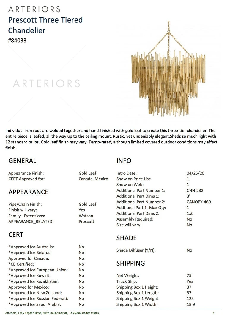 The Arteriors Home Prescott Three Tiered Chandelier in Gold Leaf features individual iron rods welded together forming this round, elegant fixture. The hand-finished application of gold leaf creates a sophisticated and unique chandelier perfect for any room in your home. Gold leaf finish will vary from fixture to fixture giving a custom feel to each Prescott Chandelier.