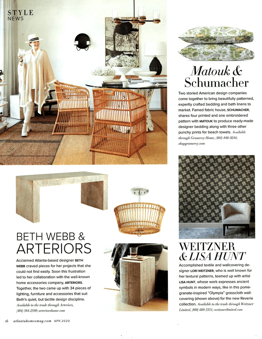 Recalling the humble yet complex architecture of a wicker basket or a birdcage, the Sea Island Flushmount from Arteriors Home has a rattan structure and an ivory linen-wrapped interior. Keenly aware of the importance light plays in a room—lending comfort, romance, and ease—designer Beth Webb created a flush mount that casts a warm, happy shadow, envisioning this light along a hallway, nursery or bathroom. * As seen in Atlanta Homes Magazine.