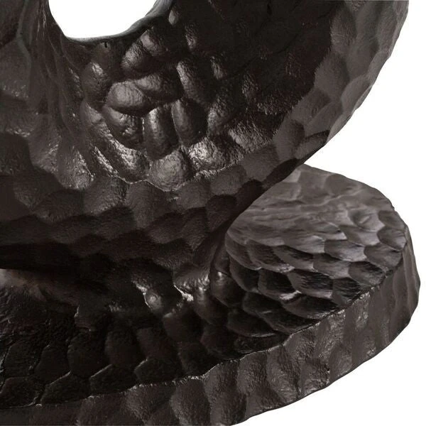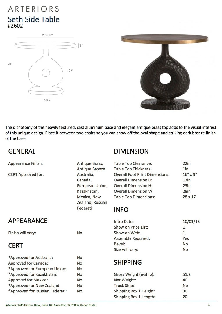 The Arteriors Home Seth Side Table has a heavily textured, cast aluminum base and elegant antique brass top that adds to the visual interest of this sculpturally designed Arteriors Home table. This modern end table fits well between two chairs in the living room so you can show off the oval shape and striking dark bronze finish of the base. The Seth Side Table is a unique conversational piece that can bring character to any room.