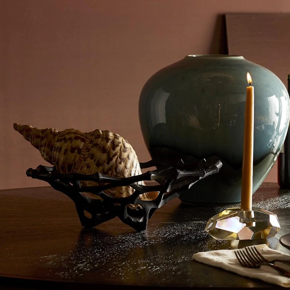 The Thorn Centerpiece from Arteriors Home features a cast aluminum web-like pattern that is finished in antique bronze. Definitely organically inspired, this striking piece definitely stands alone as a sculpture or can be filled with simple decorative objects of your choosing.