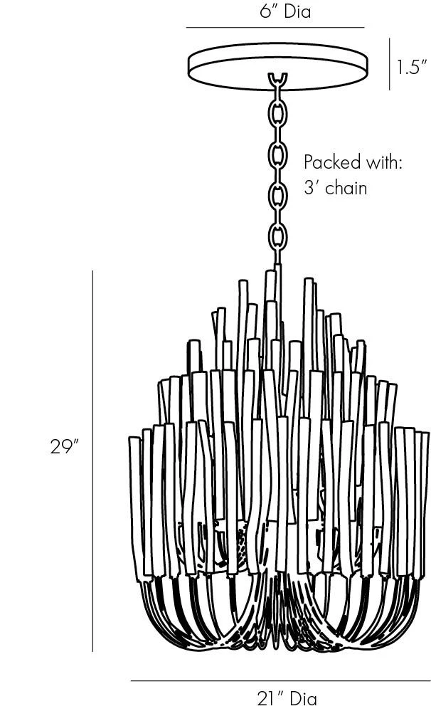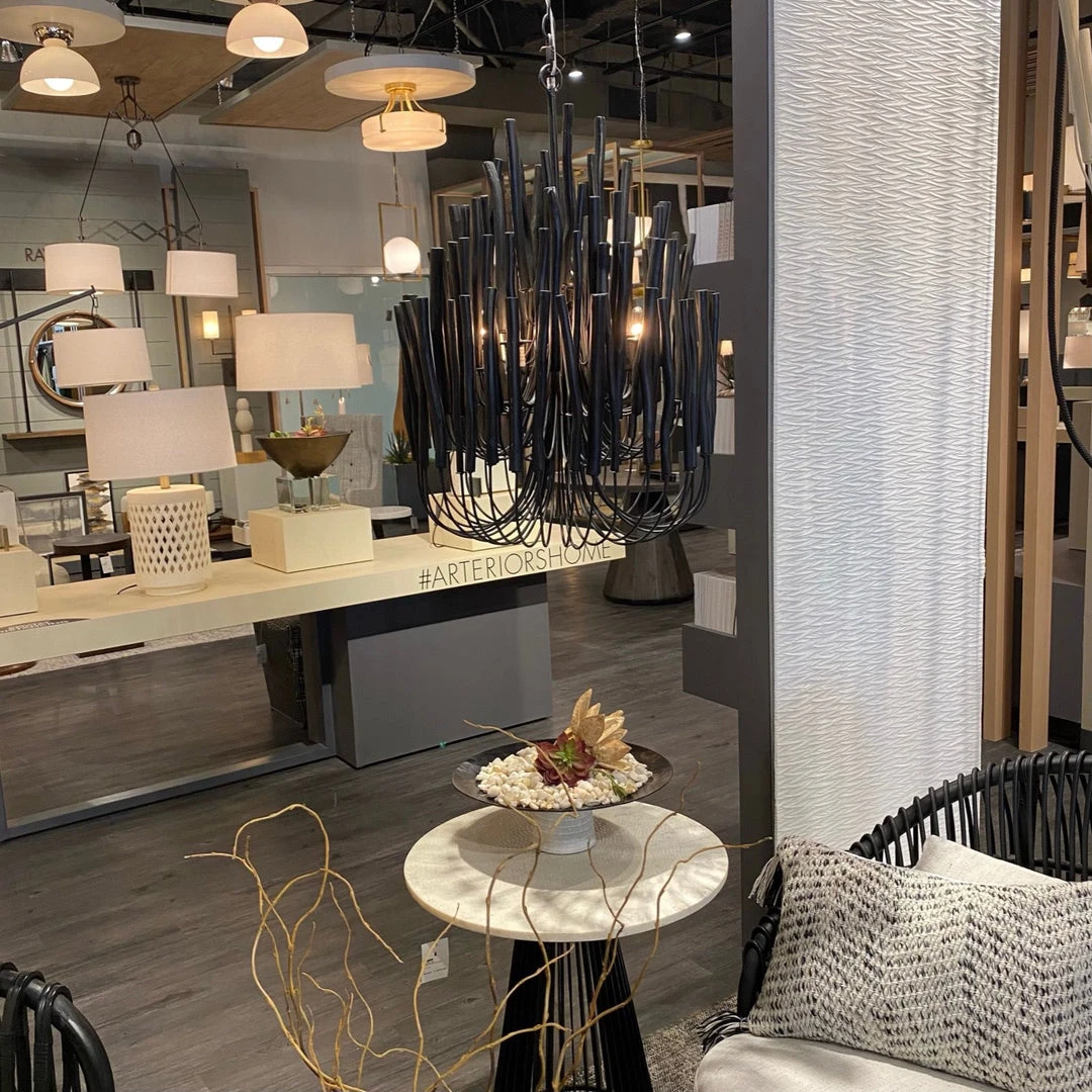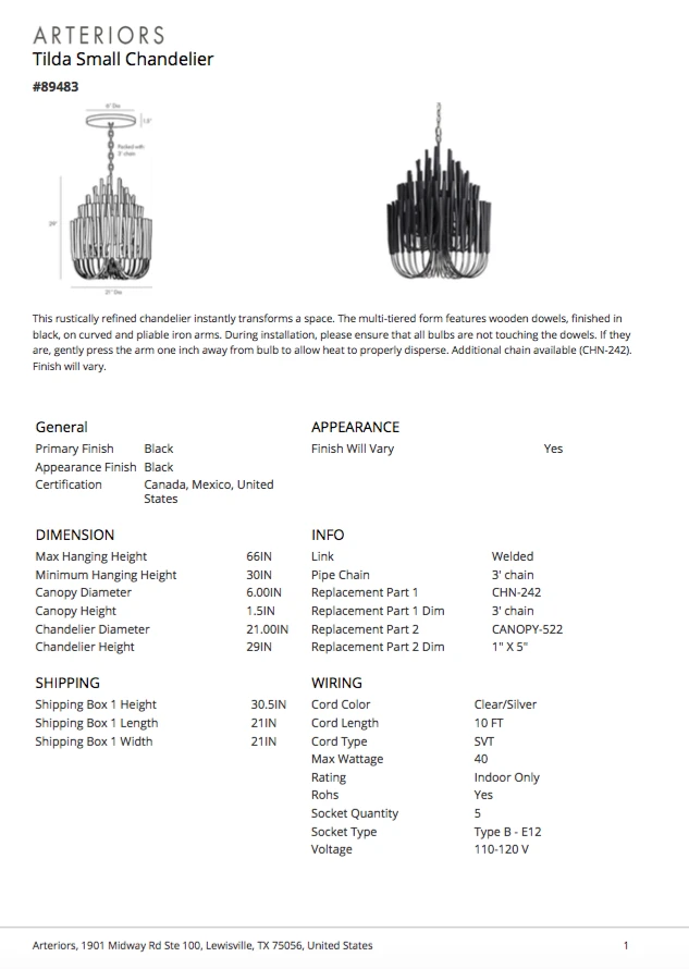 The rustically refined Tilda Small Chandelier in Black from Arteriors Home instantly transforms a space. The multi-tiered form features wooden dowels, finished in black, on curved and pliable iron arms. During installation, please ensure that all bulbs are not touching the dowels. If they are, gently press the arm one inch away from the bulb to allow heat to properly disperse. *Additional chain available (CHN-242). *Finish will vary.
