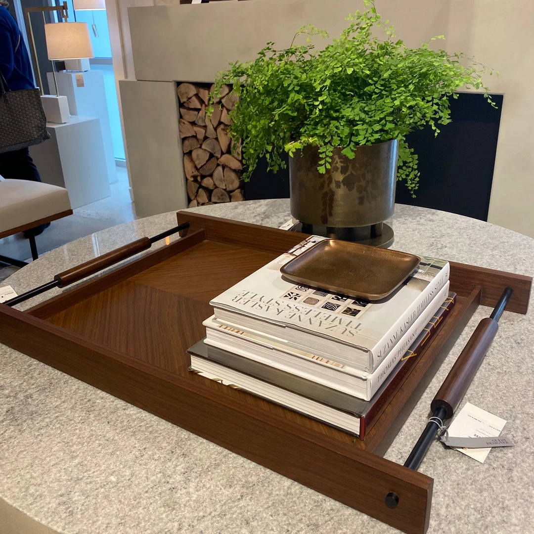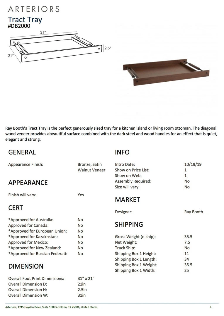 The Tract Tray, by Ray Booth for Arteriors Home, is the perfect generously sized tray for a kitchen island or living room ottoman. The diagonal wood veneer provides a beautiful surface married with the dark steel and wood handles for an effect that is quiet, elegant and strong.Â