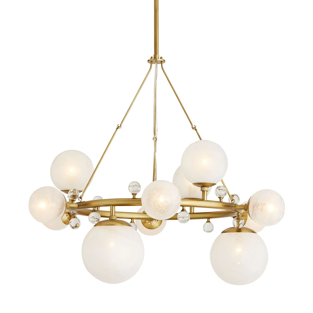 A representation of modern sophistication, the Troon Round Chandelier from Arteriors Home defines a space. Varying sizes of opal swirl glass globes embellish a sleek and slender circular steel frame that emphasizes the slightly whimsical design. Small, clear crystal knobs contrast beautifully with an antique brass finish and the visual textures of a swirl finish. *Finish will vary. **Damp rated, though limited covered outdoor conditions may affect the finish.