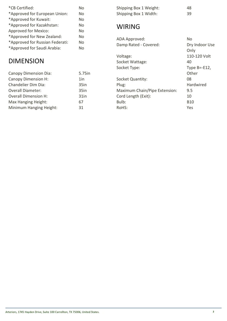 | Materials | Steel; Wood; Bulb:B10; Cord Length (Exit):10; Damp Rated – Covered:Dry Indoor Use Only; Maximum Chain/Pipe Extension:9.5; Socket Quantity:08; Socket Type:Type B=-E12 |
