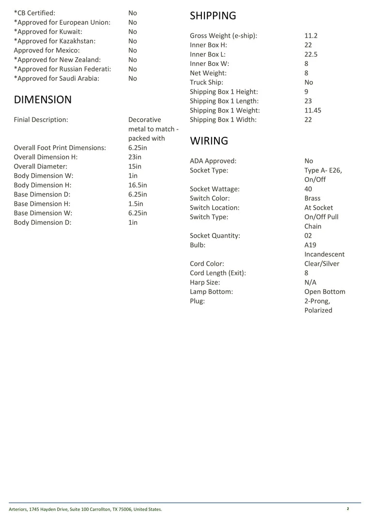 | Materials | Black Iron; Black Iron Shade; Acrylic Frosted Diffuser; On/Off Pull Chain; 80 max wattage |