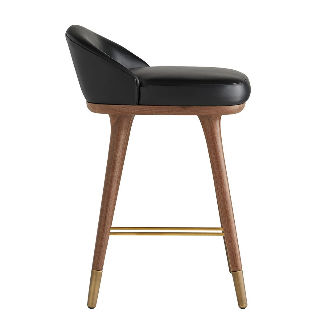 Modern design meets classic style with the Walsh Counter Stool from Arteriors Home. The black leather seat delivers a modern touch to the traditional design of the solid walnut finish wood legs, while an antique brass stretcher lends support and acts as an accent to the dark façade. Designed with a low back and no arms, the clean profile of this seat makes it ideal for tucking under a counter. *Finish and leather may vary.