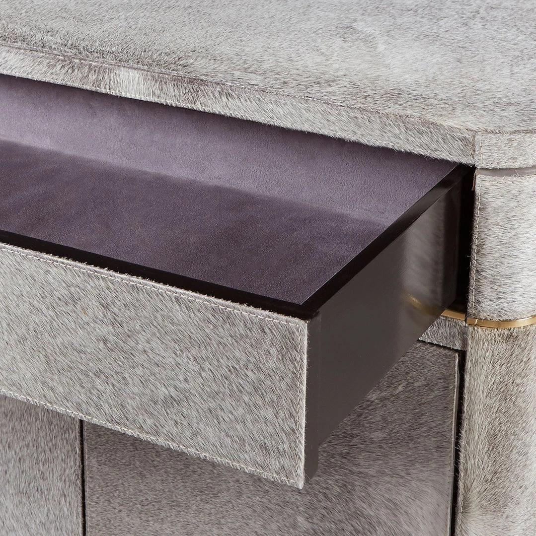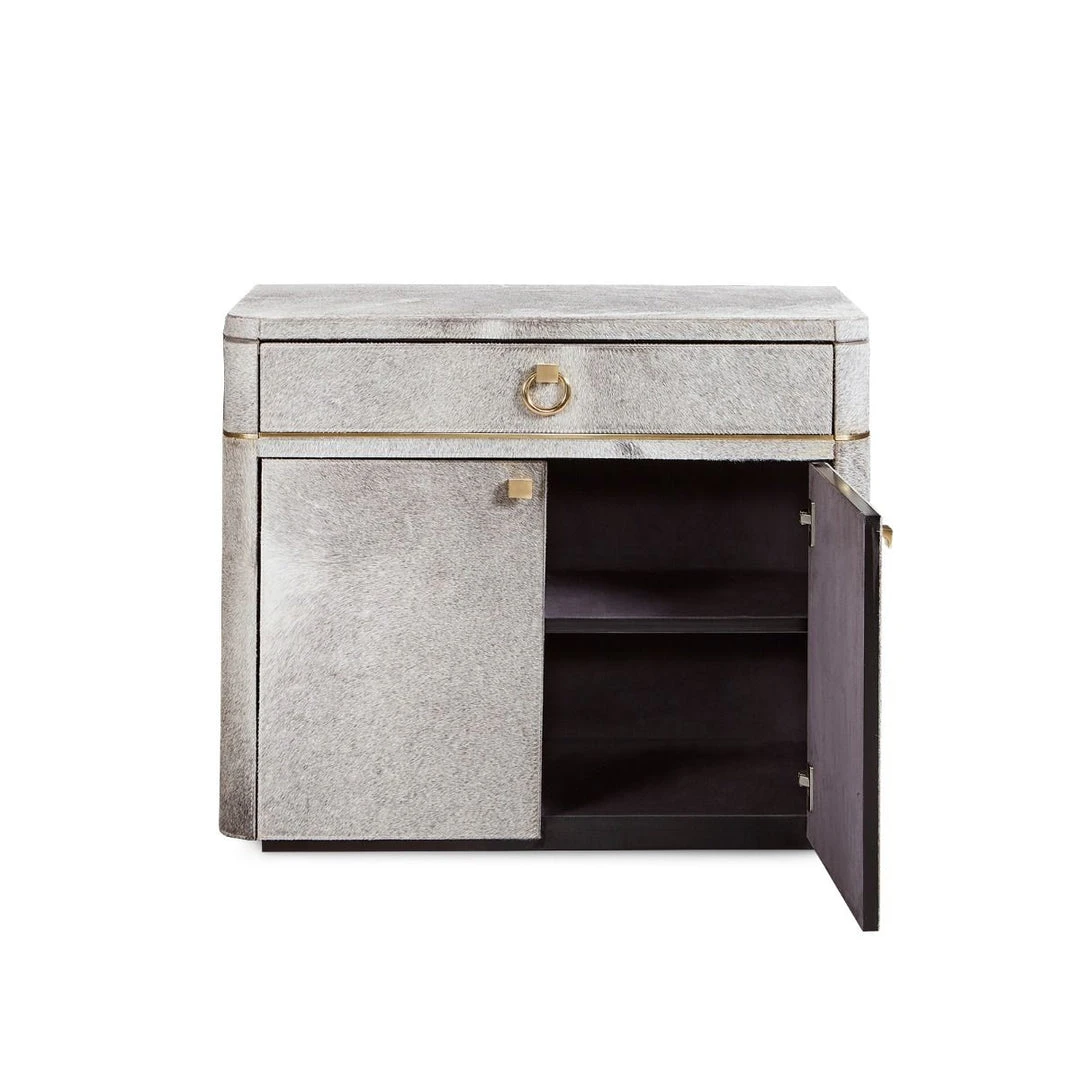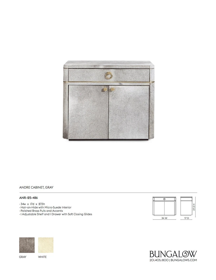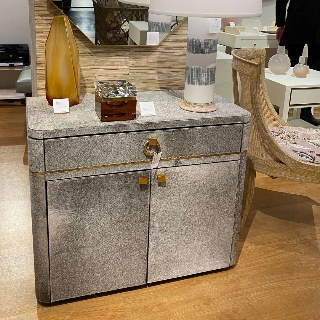| Materials | Hair-on-Hide with Micro-Suede Interior; Polished Brass Pulls and Accents; 1 Adjustable Shelf and 1 Drawer with Soft Closing Glides |