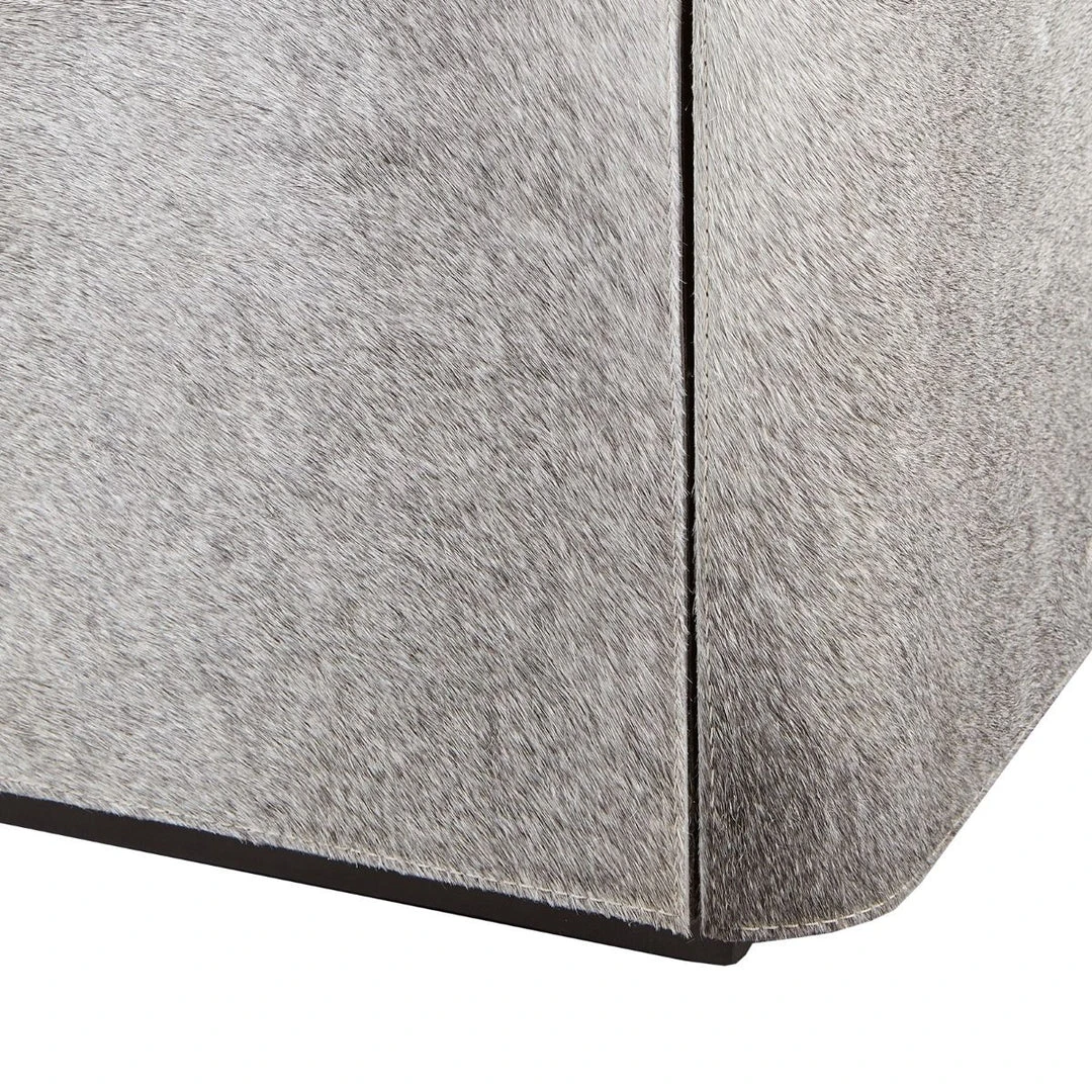 The tactile hair-on-hide covering of the Andre Cabinet in Gray will make you want to caress these soft, luxurious pieces. The curvature of the silhouette, which is reminiscent of late Art Deco design, is accented with polished brass detailing, making these pieces stylishly unique. Adjustable shelves allow for versatility, and soft closing glides with micro-suede interior add a touch of elegance.