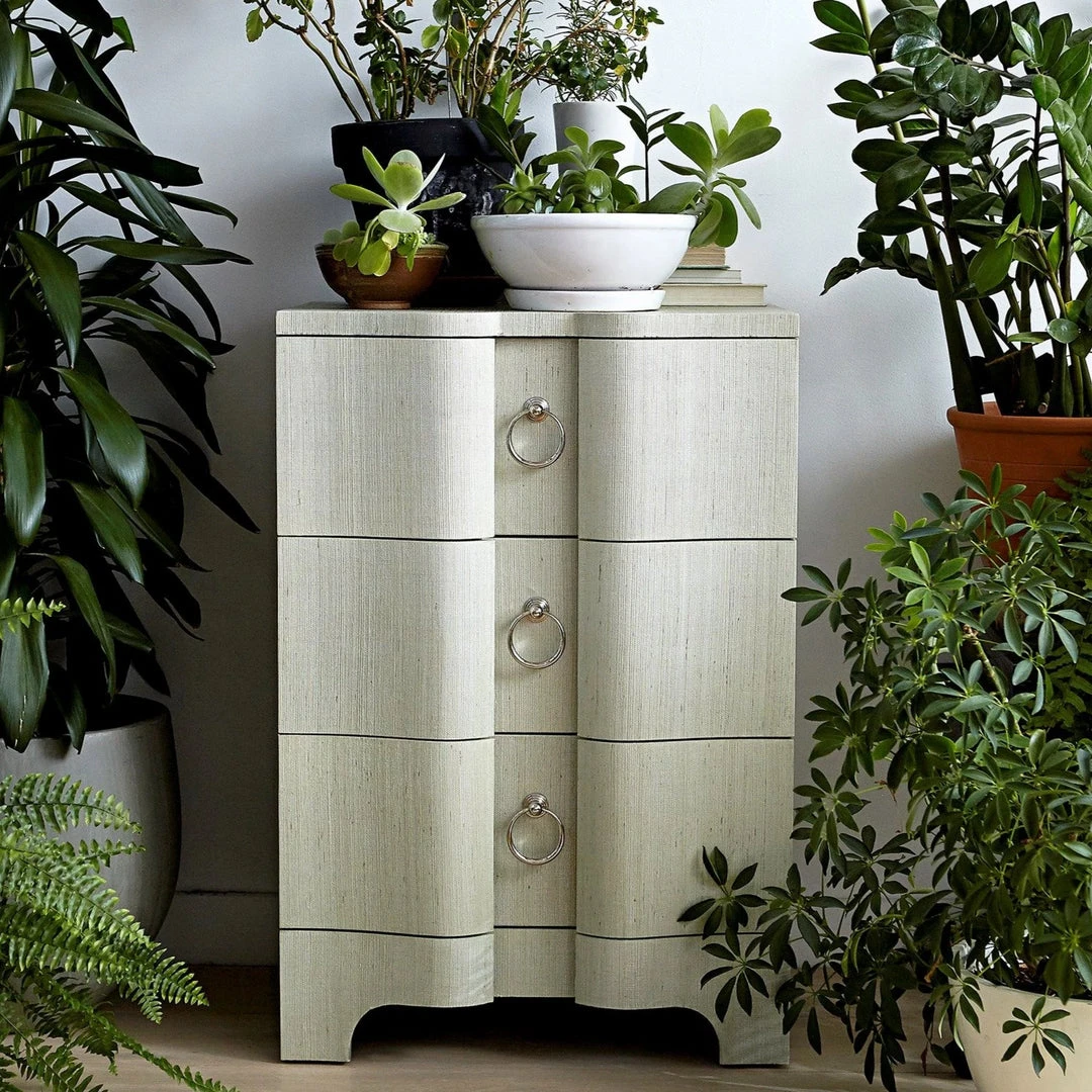 The Bardot 3 Drawer Side Table in Natural from Bungalow 5 features a beautiful deco-inspired design.  With a serpentine front and inset ring pulls in polished nickel, this compact chest has a lacquered grasscloth finish with a texture resembling painted striae.  With its refined and interesting details and warm, natural tone, the Bardot will certainly enhance your living room, office, or bedside with style and grace.Â