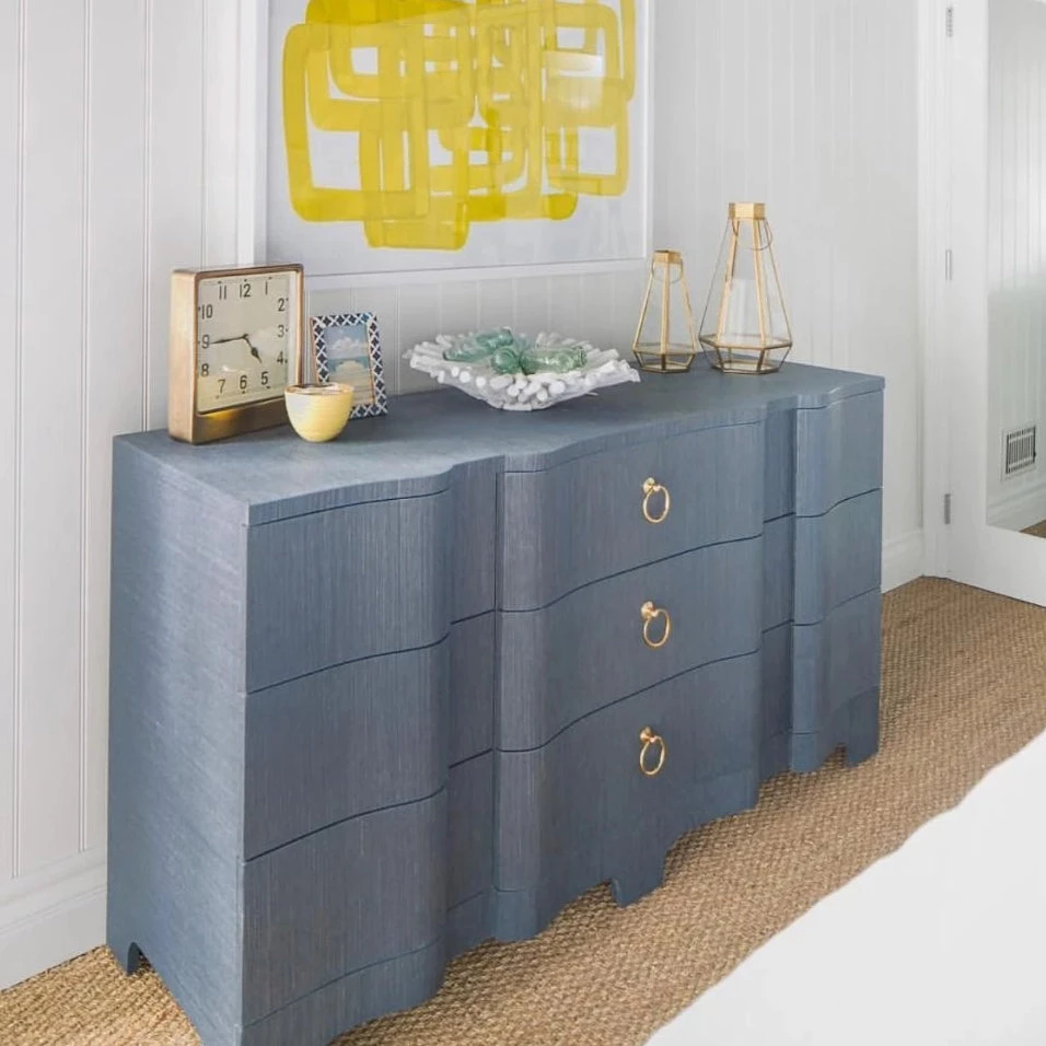 The Bardot Extra Large 9 Drawer Chest in Navy Blue from Bungalow 5 delivers a stylish nod to deco inspired design.  With a serpentine front and inset ring pulls in polished nickel, this dresser has a lacquered grasscloth finish with a texture resembling a painted strie.  With its classic and refined details, the Bardot Large 9 Drawer chest offers a classic design for your living room, office or bedroom.