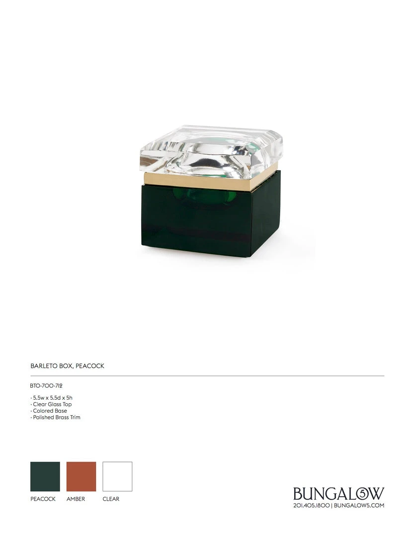The Barleto Box in Peacock from Bungalow 5 is a glamorous curio made of thick, cast glass with brass banding. By emphasizing its geometric shape, this striking accessory is distilled in an old Venetian design and made chic with a modern appeal.  The Barleto is the perfect gift or addition to desktops and shelving alike.