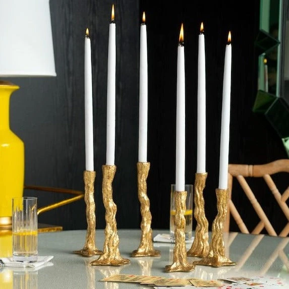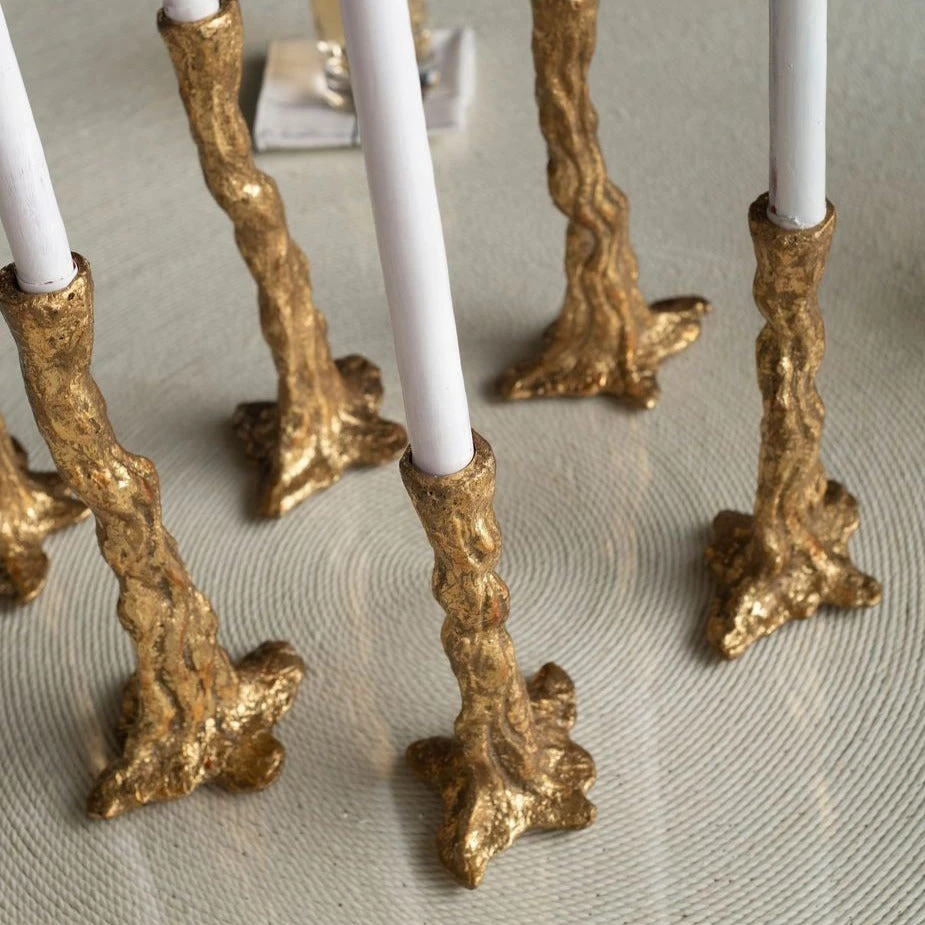 Show off your cultivated tastes with the Branch Candlestick Set in Gold from Bungalow 5. Style all three together for an effortlessly polished decorative effect atop ofa dining table, or use marching pairs in graduated sizes to create a nuanced motif. Natural elements with bold finishes make Bungalow 5’s accessories feel organic and luxurious. Please note that each item is finished with a felt bottom to prevent scratching.