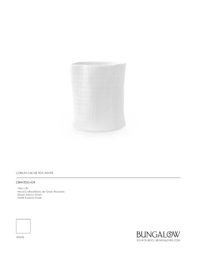 The Corum Cache Pot from Bungalow 5 is made of Blanc de Chine Porcelain. Inspired by corrugated cardboard, our artisans are playing with the concept of taking inspiration from ordinary materials and creating objet d’art. The Corum is glazed inside and matte outside. It is unmistakably modern and minimal serving as a statement piece as well as a convenient container for orchids, or those small things that often go missing.