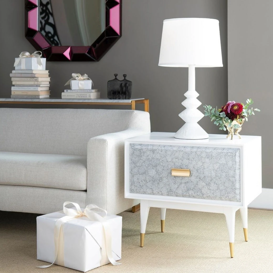 Unmistakably glamorous, the Elisa 1-Drawer Side Table in Gray is a showstopper. The collection from Bungalow 5 features rounded drawer fronts covered in pattern eggshell, and large brushed brass handles seem to hover above the angular lines of the side table’s body. There is nothing subtle about the Elisa collection. The eggshell finish on the drawers is created by an artisan using an old-world technique in which he lays, by hand, tiny pieces of eggshell into a unique pattern over a linen foundation. Each piece of the eggshell is meticulously adhered, fitting in like a puzzle piece. The artisan then covers the design with myriad layers of hand-painted lacquer to achieve a smooth finish. The result is a usable piece of artwork.