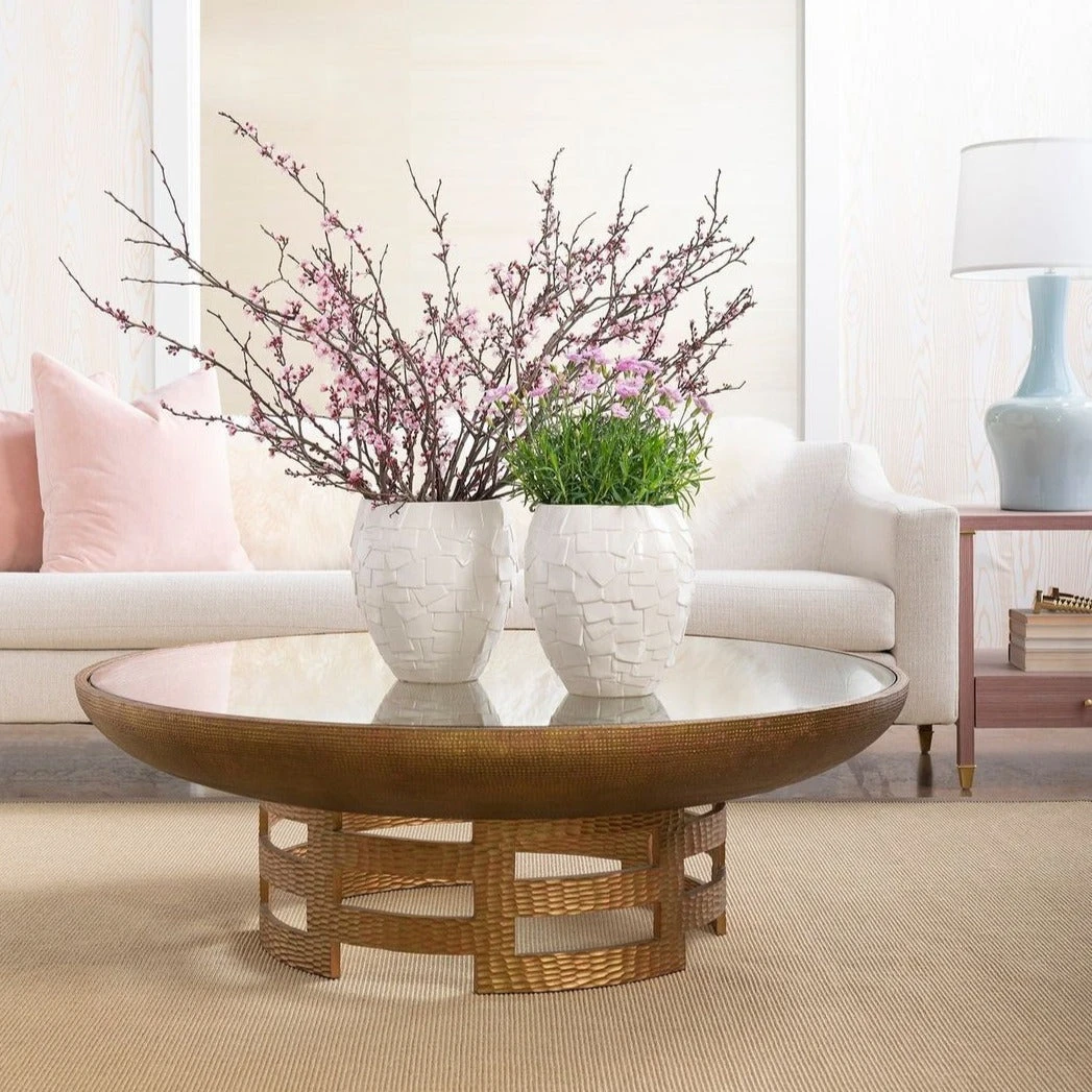 The Ella Coffee Table in Antique Brass from Bungalow 5 is a stunning piece that takes inspiration from a traditional Chinese design motif and combines it with a modern sense of space and texture. Peering through the tempered glass top to reveal the intricate hand-hammered fretwork base that gives this table its unique appeal. With a silhouette reminiscent of a symphonic tympani drum, the Ella is clad in antique brass for a sophisticated finish. The piece is a superb anchor for the design of your den or living room.