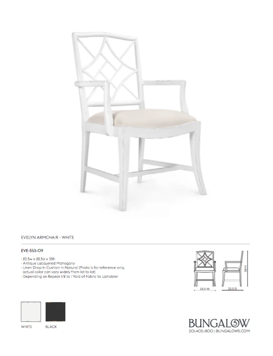 The Evelyn Armchair in White from Bungalow 5 is handcrafted of solid mahogany in a simplified version of Thomas Chippendale’s Chinoiserie design. The fretwork back has a softly rounded top and straight bottom. Other great details include a curved seat deck, simply fluted tapering legs, and simple stretchers. Armchair versions inset to the seat in a pretty curve.
