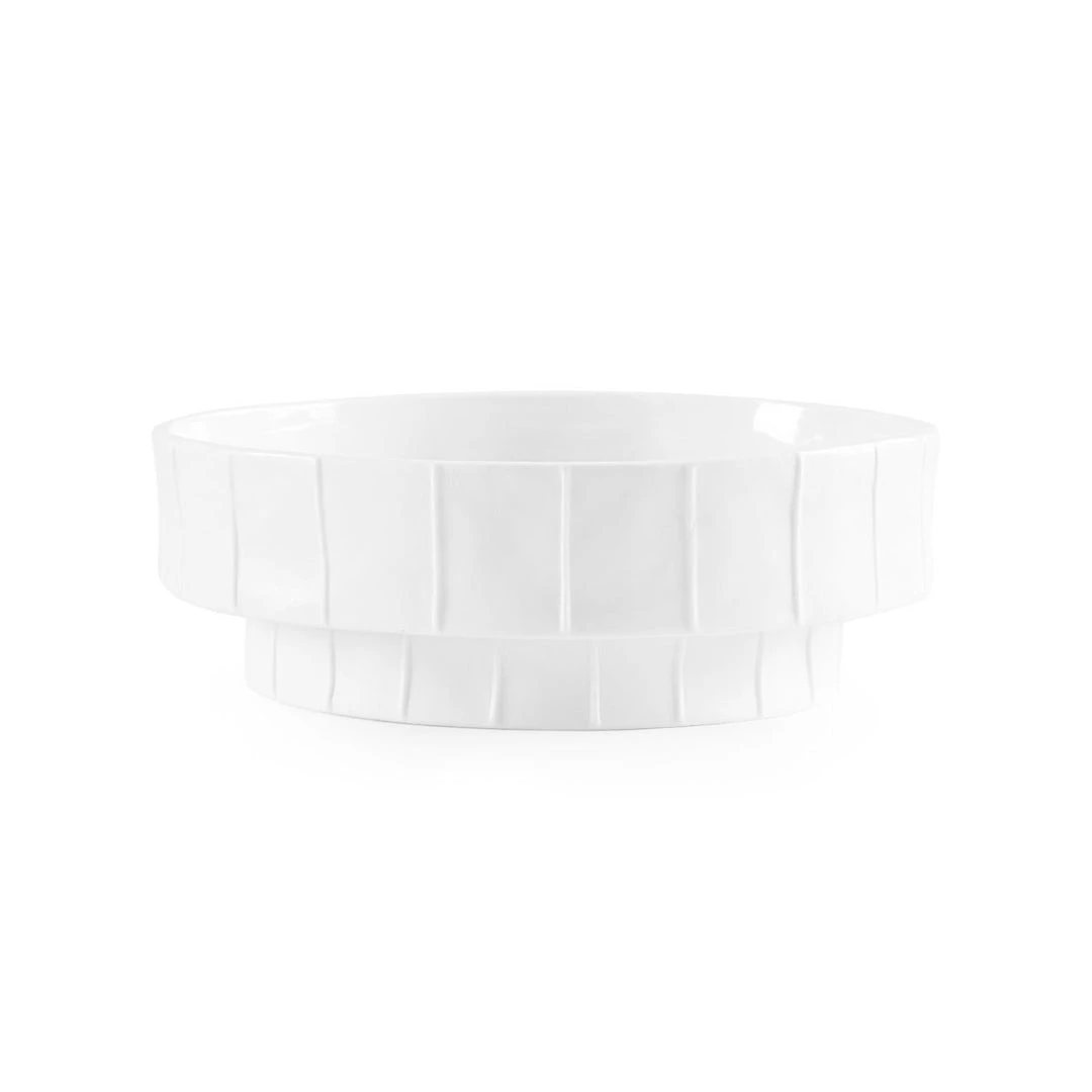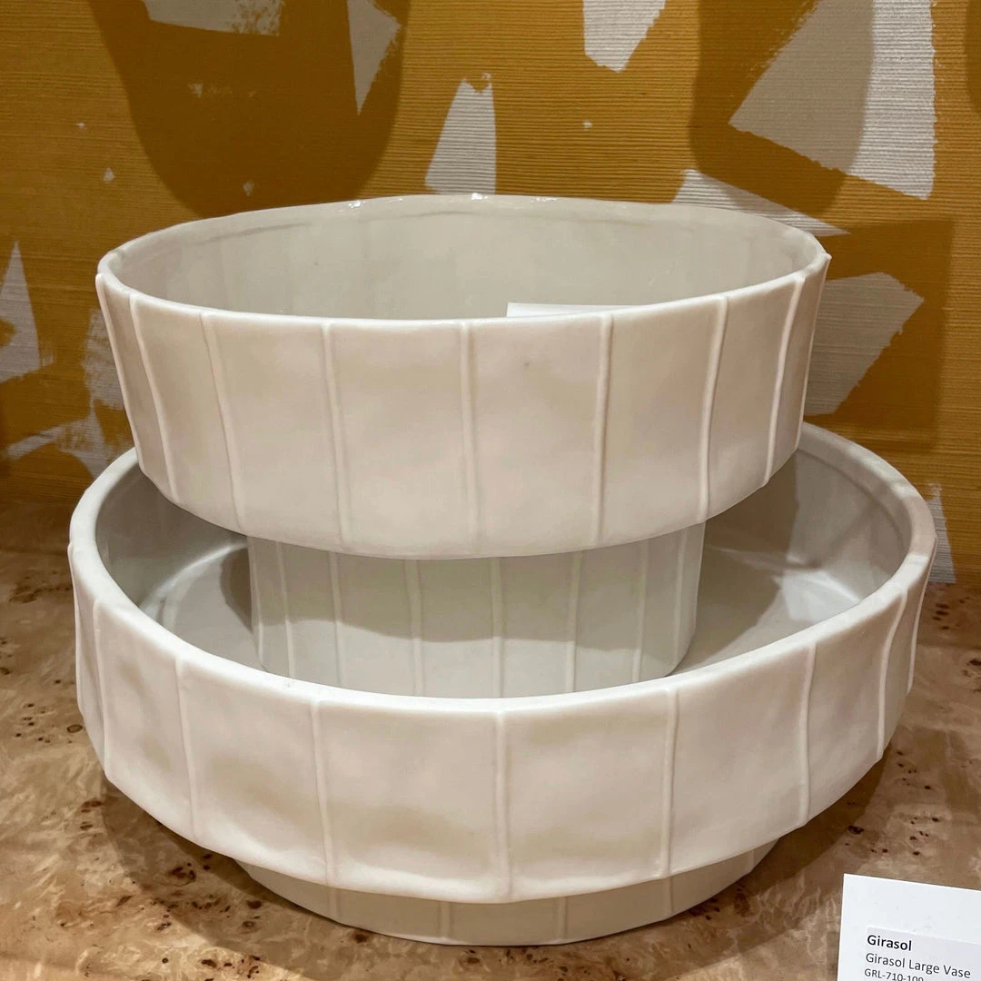 Based on a traditional shape—a smaller base with a wider top—the Girasol Large Vase in White from Bungalow 5 is inspired by architectural constructivism which highlights materials and construction. In this vase, delicate strips of white porcelain have been seamed together in a way that emphasizes its hand-made qualities. Produced by craftsmen descended from the same ones which created masterpieces for the imperial court, the Girasol combines very old traditions with contemporary aesthetics. It has a glossy interior finish and a matte exterior. The Girasol makes the perfect catchall in your entryway, a lovely fruit bowl in the dining room, or a stunning sculptural piece on a sideboard or etagere.
