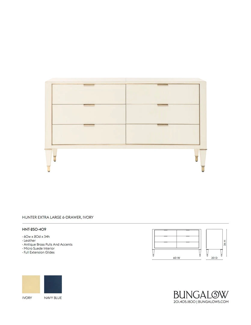 The Hunter Extra Large 6 Drawer Chest in Ivory from Bungalow 5 takes inspiration from a neo-classical design. Artisans have crafted this grand piece with fine leather and custom-cast metal fixtures and hardware. Place the Hunter as a bedroom dresser or in the dining room or home office for chic, functional storage.
