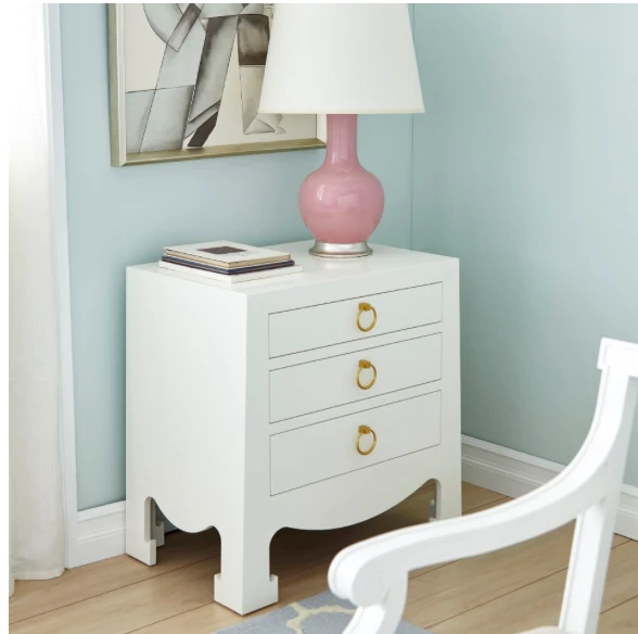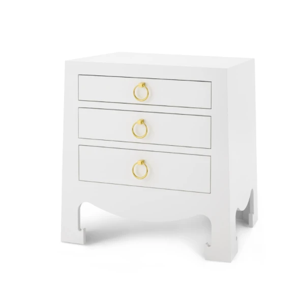 The Jacqui 3 Drawer Side Table in White Grasscloth is a Bungalow 5 classic. Reflectivity, color and unexpected details are the hallmark of the Jacqui collection. The Jacqui 3 Drawer Side Table is crafted from shaped wood and elegant details like Chow style feet, simple round pulls and a softly burnished lacquer finish on Grasscloth. Place the Jacqui in the Master Suite as bedside tables or in the living room as side tables with extra storage space.