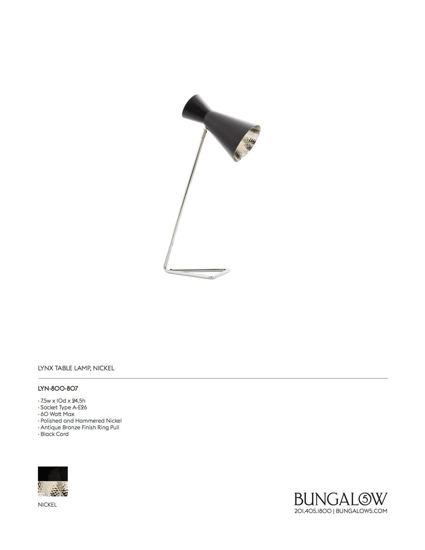 Showcased by Bungalow 5, the Lynx Table Lamp is a measured example of balance. The bright reflection of the hand hammered shade interior balances the black of the powder coated exterior. The dramatic visual presence of the shade is counterbalanced by the slender lines of a nickel base that mirrors its silhouette making this stylish and functional lamp a versatile piece that blends seamlessly with a variety of home décor schemes.