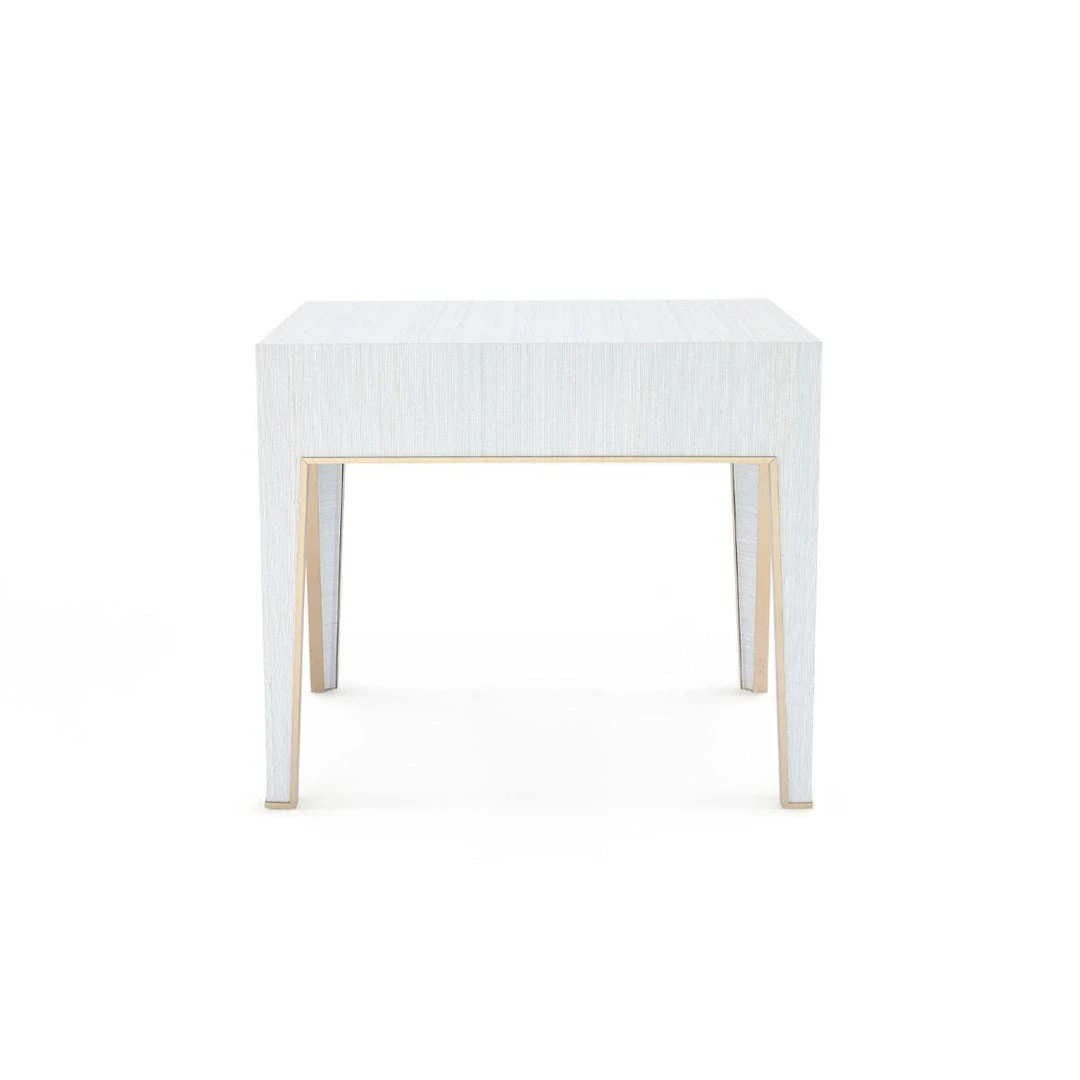 The Madeline 1 Drawer Side Table Platinum from Bungalow 5 is endlessly elegant, with fabulous bronze in a striking champagne finish tracing the bottom drawer front. The 1-Drawer Side Table is sleek in its construction with an angular, pin-stripe aura of the 20s. The Platinum color is a lacquered silk grasscloth, fully wrapped on each tapered leg and surrounding the entire perimeter of the piece. Feel free to float this beauty in the middle of your room. The Madeline Collection packs the perfect punch of subdued glam that Bungalow 5 is known for and would be right at home in a stately master bedroom, flanking a regal couch in a living room or used strategically in a luxurious study.