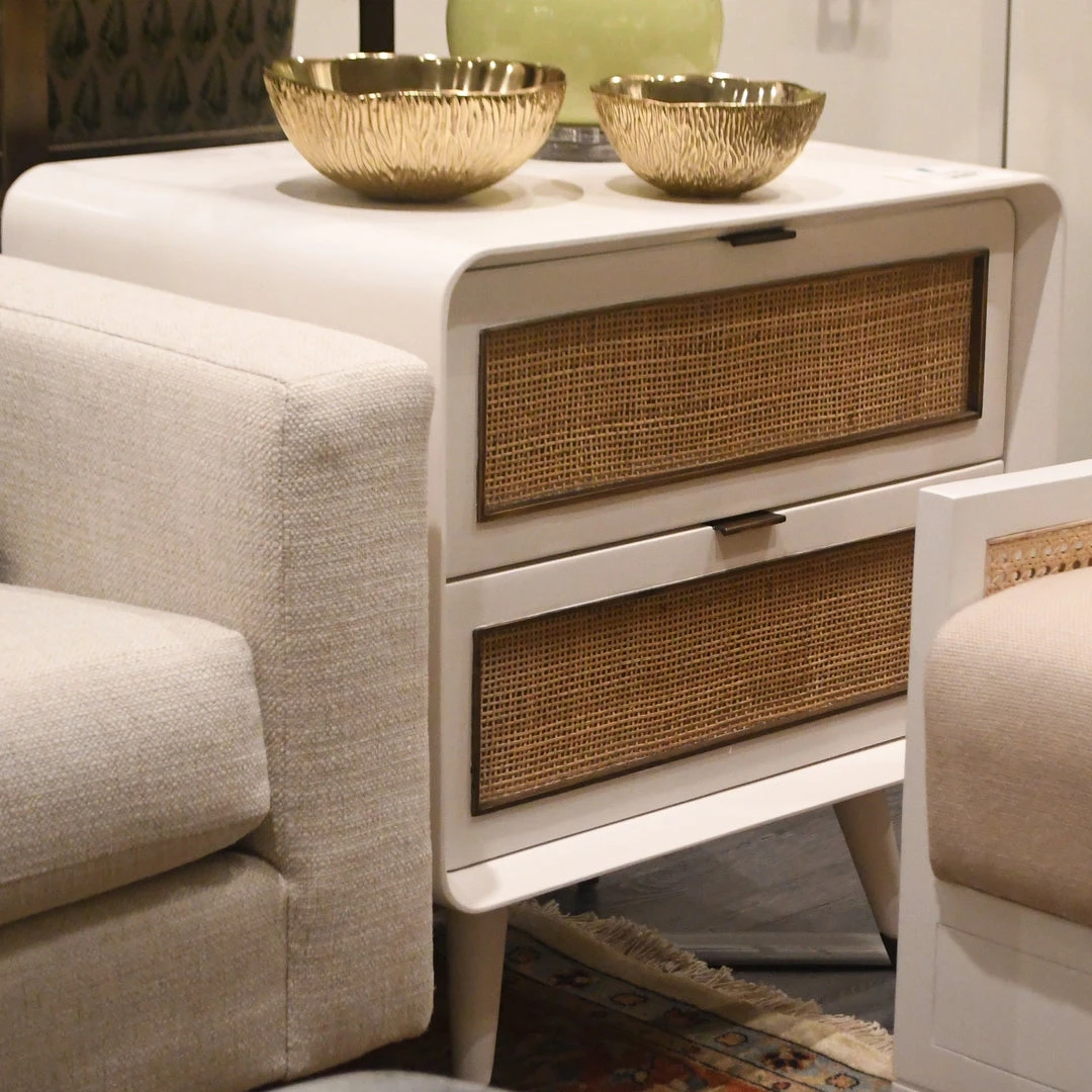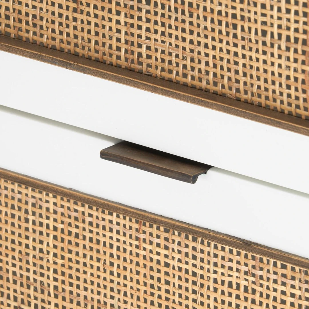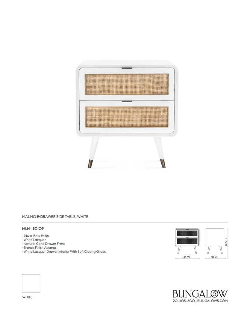 The Malmo 2 Drawer Side Table in White from Bungalow 5 unites sophisticated mid-century design with natural, handcrafted details, resulting in a piece versatile enough for both formal and more casual interior décor. The bronze details complementing the natural, handwoven-cane drawer fronts add a wonderfully urbane touch to this nightstand.