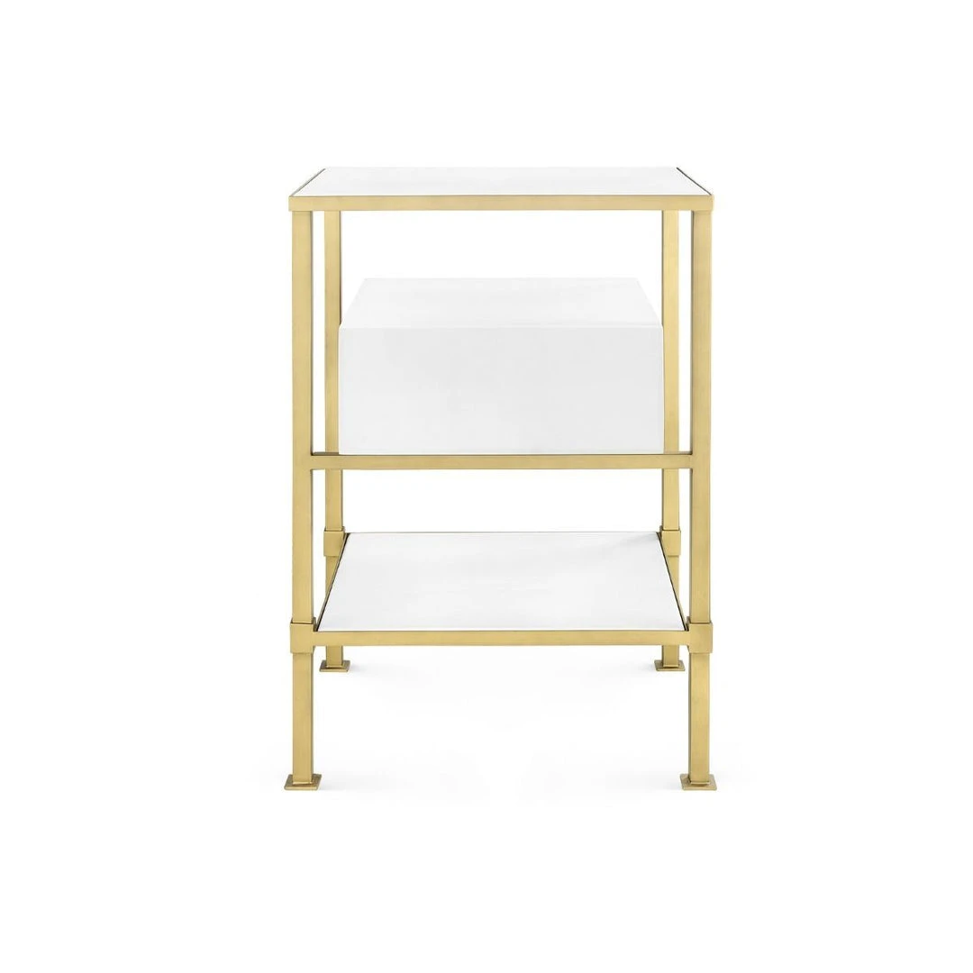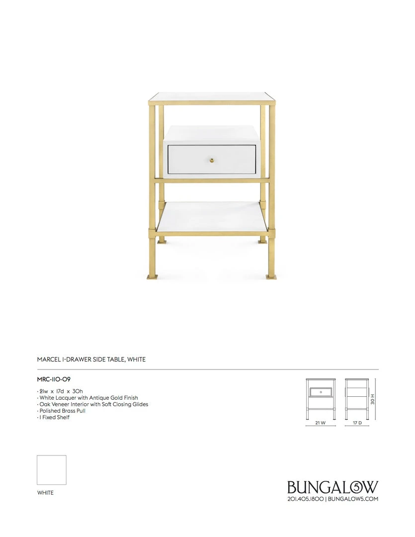The Marcel 1 Drawer Side Table in White from Bungalow 5 recasts a classic Art Deco design with contemporary proportions and sensibilities. With a slightly industrial feel, the Marcel balances classic and modern design elements. Considered design details include an antique gold finish paired with sleek white lacquer cabinetry.  Soft closing glides and oak veneer drawer interiors, elevate this accent table with attention to every detail.
