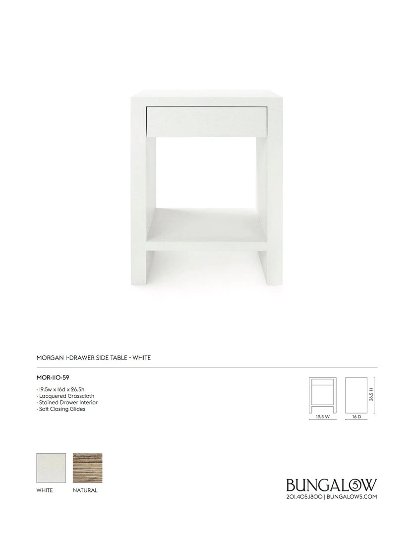 The Morgan 1 Drawer Side Table in White from Bungalow 5 offers a modern interpretation of simple shapes and refined proportion with an elegant lacquered grasscloth. The Morgan features resolved architecture and textural interest with versatile display options that are both monumental and demure. Place the Morgan in bedrooms as well as living spaces and home offices.
