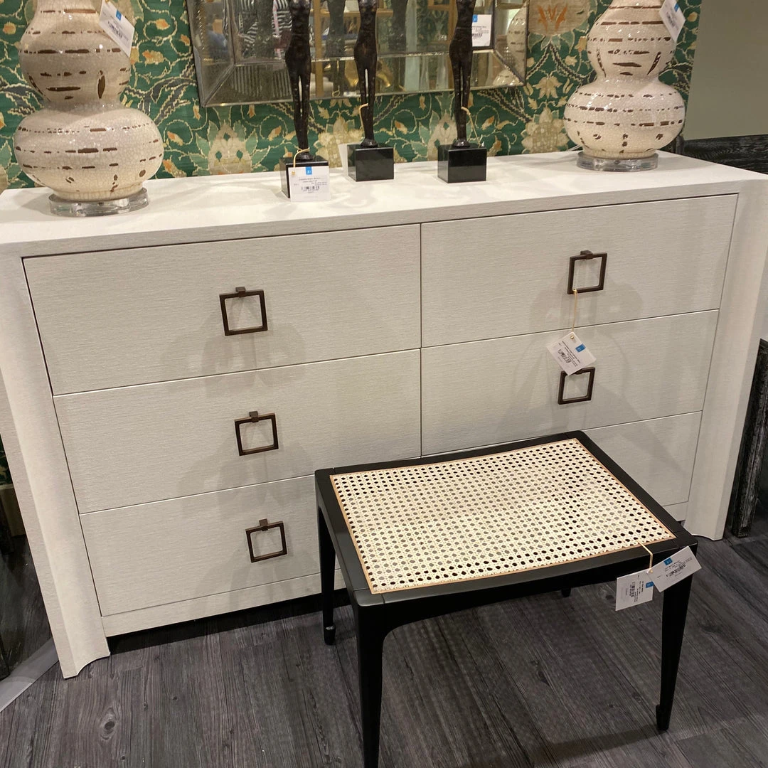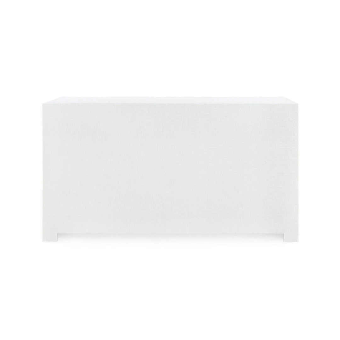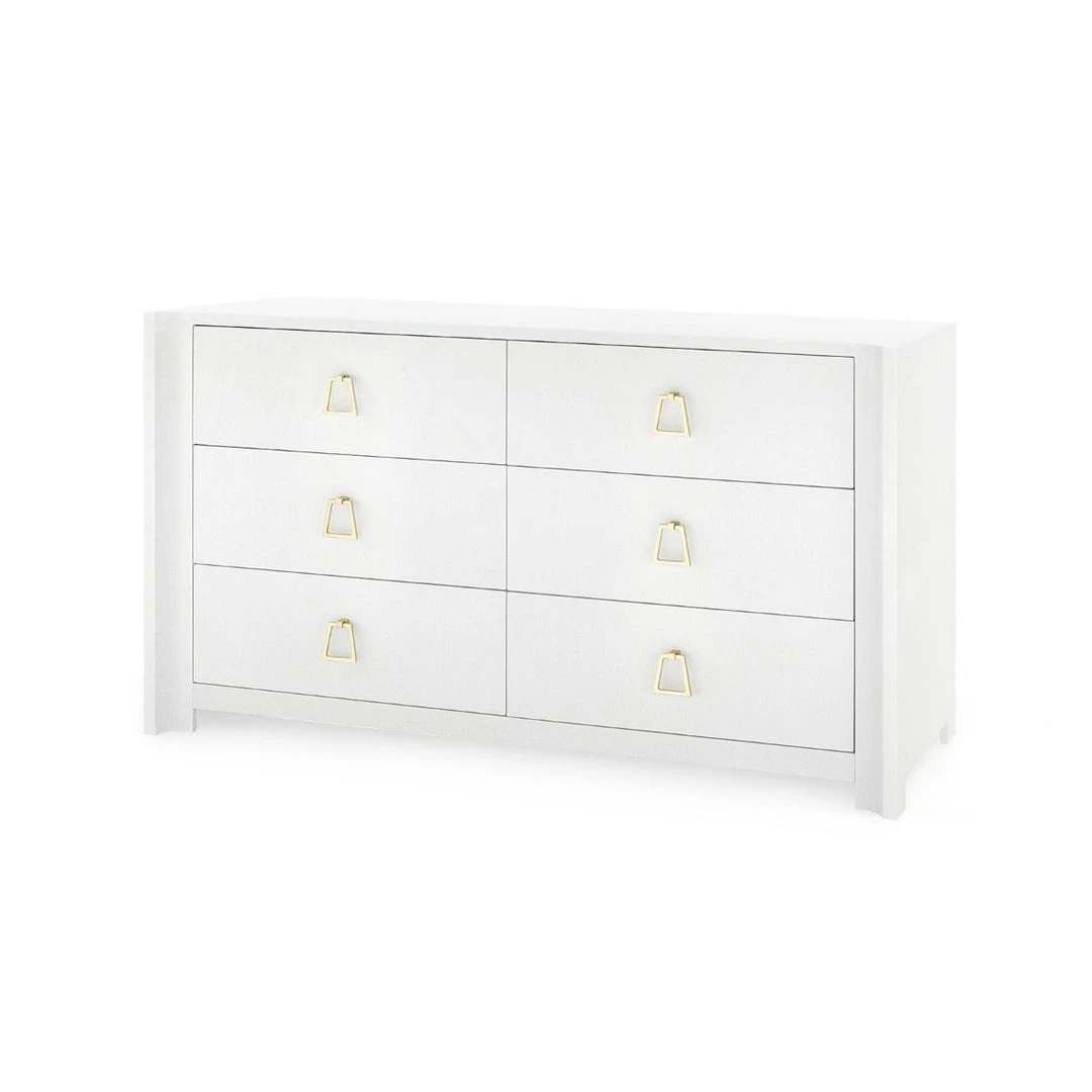 The Audrey Extra Large 6 Drawer Dresser in White from Bungalow 5 is wrapped in a soft color palette of lushly textured lacquered linen, which has been seamlessly wrapped on all sides by hand to give the pieces a sophisticated, timeless and natural finish. Brass pulls will fit into any design scheme, making a unique statement piece for your home.