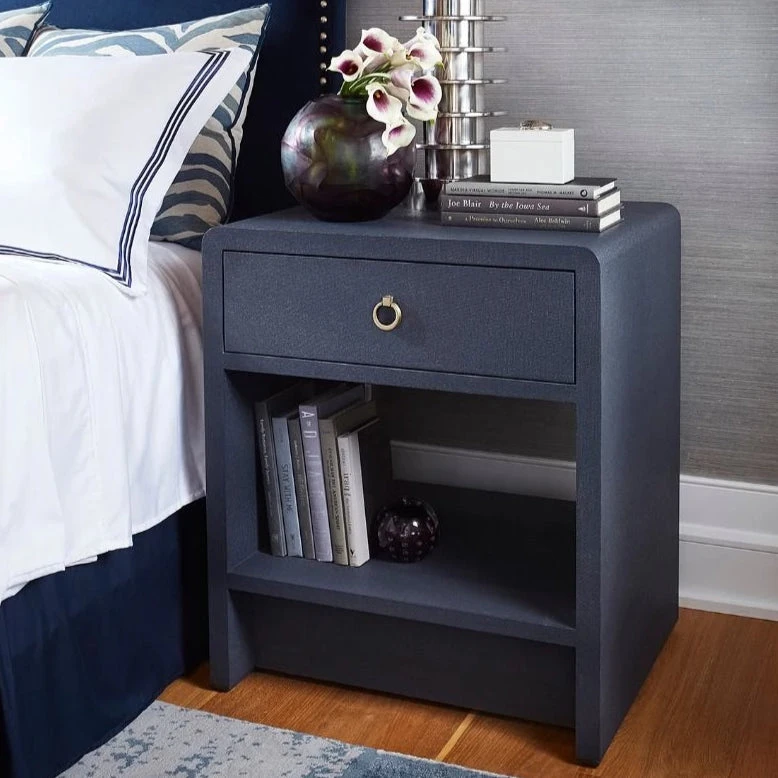The Benjamin Linen 1 Drawer Side Table in navy blue from Bungalow 5 is a clean take on classic modernism. Its straight lines, flush-fitted drawers, and geometric shapes are balanced with distinctive soft corners, soft closing drawer glides and a ring pull finished in antique brass.  With a lacquered linen finish, inset base, and open center, the mid-century inspired Benjamin Linen 1 Drawer Side Table fits lightly and seamlessly next to a bed or used as a sofa table in any modern space.